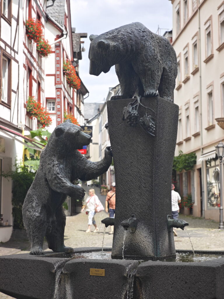 Wenn du durch die Hebegasse, Römerstraße oder Graacher Straße schlenderst, fühlst du dich sofort in eine andere Zeit versetzt. Die engen, gepflasterten Gassen sind gesäumt von Boutiquen, Vinotheken, Galerien und Cafés, in denen regionaler Wein und Kunst zum Verweilen einladen – ein idealer Ort, um die Atmosphäre der Stadt auf sich wirken zu lassen. An der Graacher Straße liegt ein größerer Platz. Hier steht der Bärenbrunnen. Der Bärenbrunnen, gelegen am „Bärenpütz“ hat seinen Namen von einem älteren Brunnen an gleicher Stelle. Pütz ist eine regionale Bezeichnung für einen Ziehbrunnen. Der Name der Stadt Bernkastel leitet sich der Legende nach vom Begriff „Bärenkessel“ ab. Dies erklärt, warum der Bär das Wappentier von Bernkastel ist und in der Stadt immer wieder als Motiv auftaucht. Der heutige Bärenbrunnen wurde im Jahr 1968 eingeweiht. Er ist ein volkstümliches Kunstwerk des Wittlicher Bildhauers Hanns Scherl. Das Herzstück sind zwei lebensgroße Bären aus Bronze, die auf einem Sockel stehen.