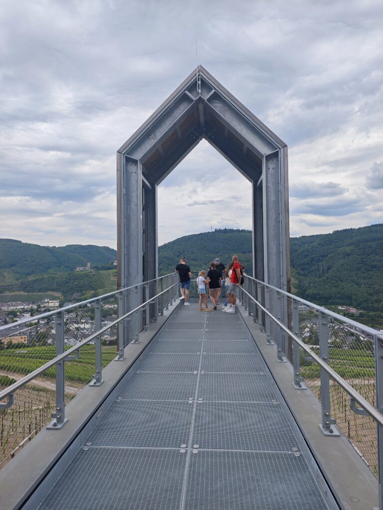 Die Plattform selbst ist ein architektonisches Highlight. Sie ist in einer schlanken, fast schwebenden Bauweise konstruiert, die du schon von der Mosel aus sehen kannst. Von hier siehst du ein Portal, in dem sich der Aussichtspunkt befindet. Der Boden besteht aus einem Gitterrost, was das Gefühl der Höhe und der Freiheit noch verstärkt. Der Blick von der Plattform ist atemberaubend: Du siehst das historische Stadtzentrum von Bernkastel-Kues mit seiner Fachwerkkulisse, die majestätische Burg Landshut und die mäandernde Mosel, die sich durch die Landschaft schlängelt. Der Stadtteil Kues mit seinen Weinbergen liegt dir zu Füßen. Die umliegenden terrassierten Weinberge, die das Tal prägen, wirken von hier oben besonders eindrucksvoll.