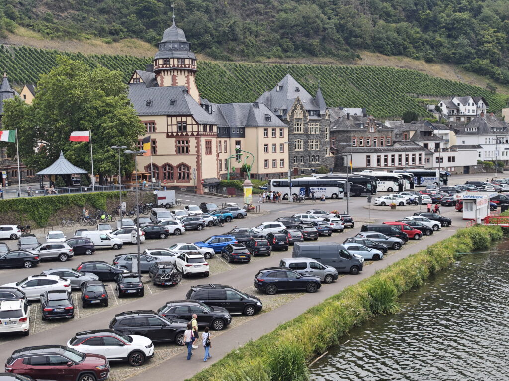 Dieser weitläufige Parkplatz liegt im Stadtteil Bernkastel, unmittelbar an der Moselbrücke. Er erstreckt sich entlang des Flussufers und ist die Hauptanlaufstelle für Besucher, die direkt die Altstadt von Bernkastel ansteuern möchten. Mit einer Kapazität von rund 550 Stellplätzen ist er der größte Parkplatz in der Stadt. Er dient nicht nur als Parkplatz für PKWs, sondern verfügt auch über ausgewiesene Stellflächen für Busse. Du kannst auf diesem zentralen Parkplatz nicht mit dem Wohnmobil parken. Seine Lage direkt am Flussufer bietet einen malerischen Blick auf die Mosel. Von hier aus sind es nur wenige Gehminuten zum berühmten Marktplatz mit seinen Fachwerkhäusern, Cafés und Geschäften. An sonnigen Tagen ist dieser Parkplatz oft schnell belegt. Für deine Orientierung hier der Link zur Google Karte.
